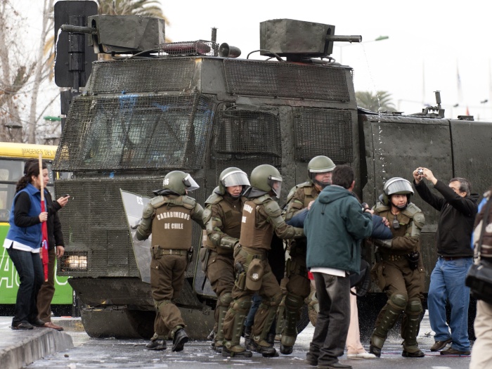 Confrontos e protestos incendeiam a capital do Chile, Santiago, desde as 12h desta quarta-feira (24). Ao menos cinco pontos da cidade - incluindo a entrada da Universidade do Chile, em uma das principais avenidas - estão repletos de "caveirões" da polícia local, que usa jatos de água e gás lacrimogênio para dispersar os manifestantes.