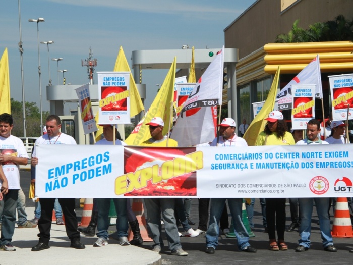 Membros do Sindicato dos Comerciários de São Paulo voltaram a se reunir com faixas e carros de som na porta do shopping para protestar pela garantia do emprego dos quase 6.000 funcionários.